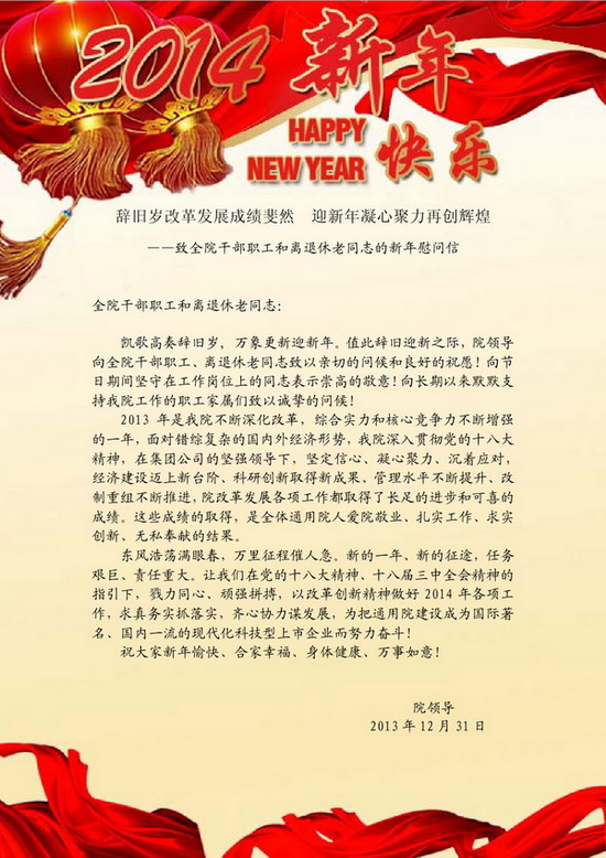 辞旧岁改革发展成绩斐然 迎新年凝心聚力再创辉煌――致全院干部职工和离退休老同志的新年慰问信