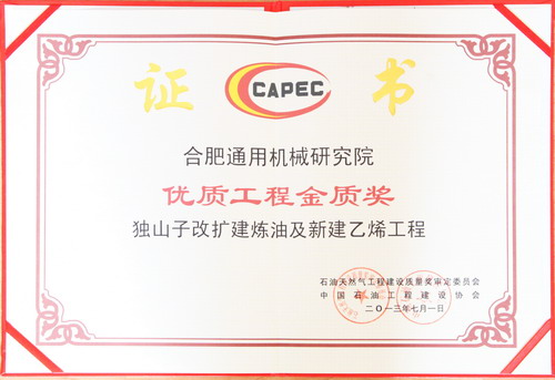 日前,从中国石油独山子石化分公司获悉,由我院参建的“独山子改扩建炼油及新建乙烯工程”被中国石油“石油天然气工程建设质量奖审定委员会”、中国石油工程建设协会联合评为2013年石油优质工程金质奖,我院作为该工程主要承包商之一,获颁石油优质工程金质奖奖牌和证书。