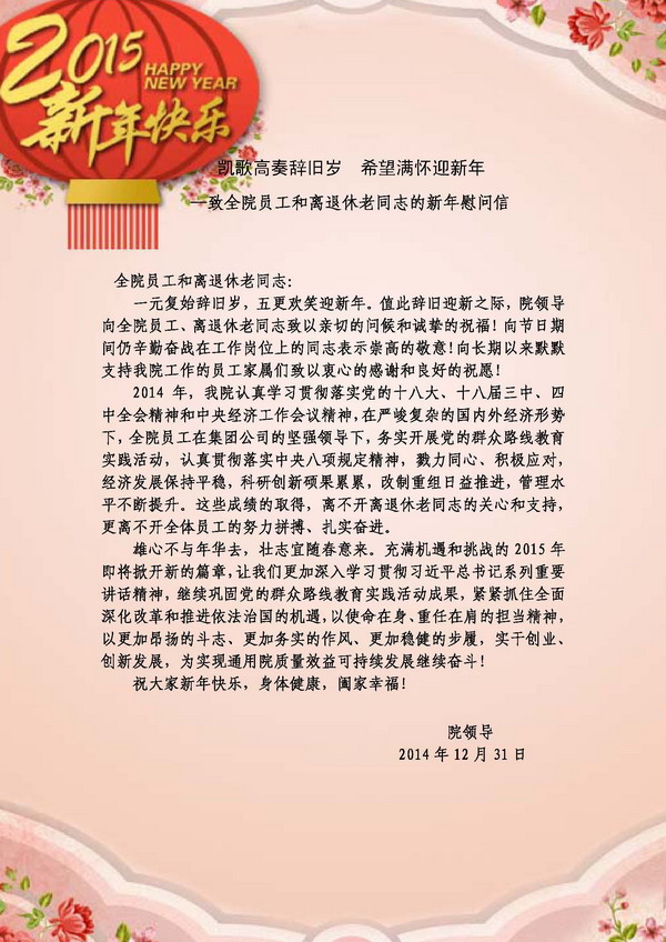 凯歌高奏辞旧岁 希望满怀迎新年--致全院员工和离退休老同志的新年慰问信